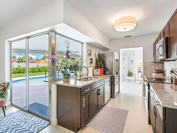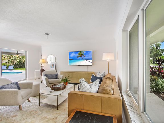 Enjoy the beauty of the modern kitchen, dining room, and pocketing slider doors that seamlessly connect indoor and outdoor living spaces. Step outside to a recently renovated pool with exquisite marble tile pavers, creating a luxurious atmosphere for outdoor relaxation and entertainment. The home also features a 2-car garage and a generously-sized covered pool patio. AND--a prize mango tree in the back yard that yields some of the largest juiciest fruit you can imagine!