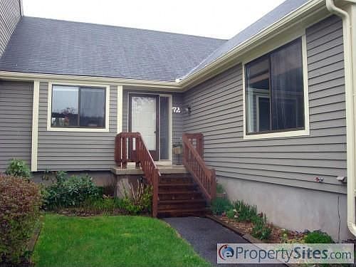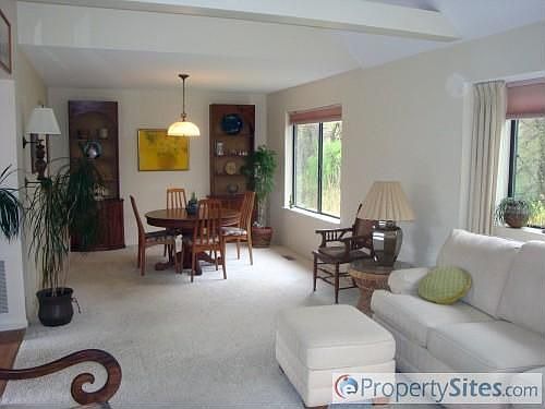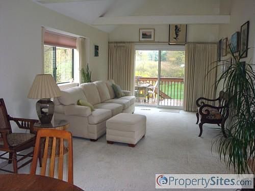 Bright sunny end unit overlooking natural woodlands. Sliders from living rm. open to private deck. Lots of windows.Bedrms have new carpeting.Both have walkin closet & access to the full bath. 1st flr laundry. Lovely pastoral setting near Bloomfield Center