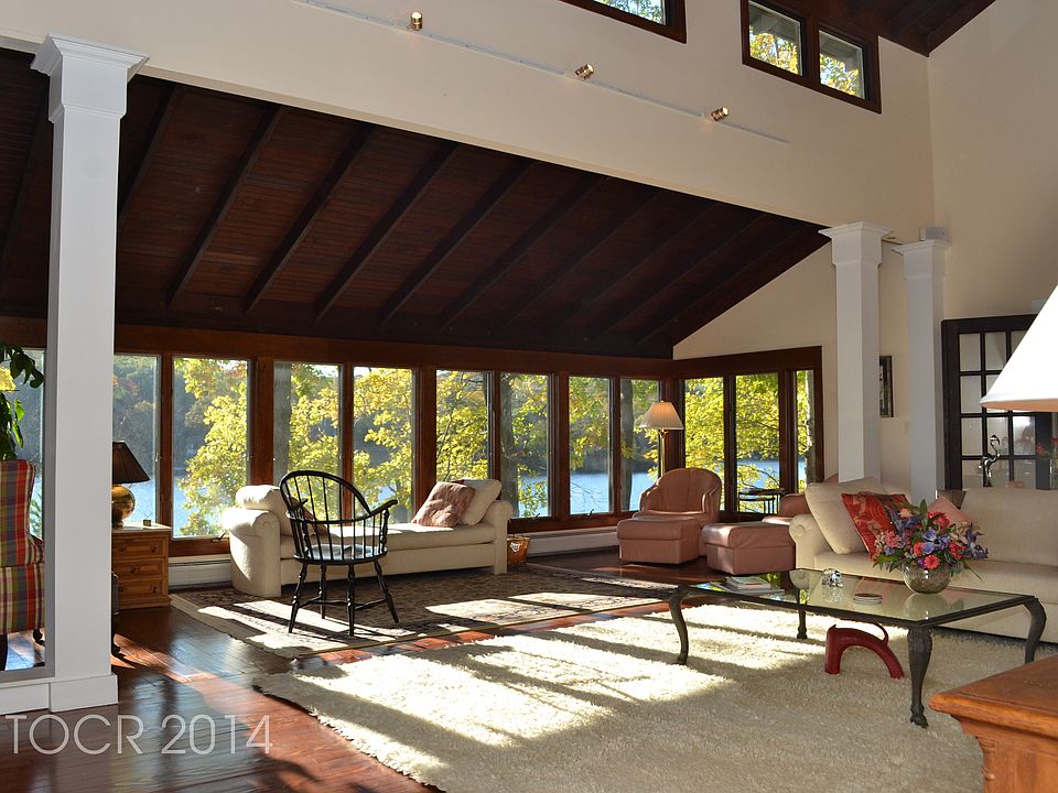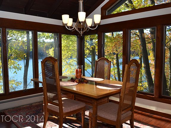 Fascinating history of this Lakefront home and the lake community in general. Spectacular 3BR/2.5BA, 2-car Garage custom lake-style home on pristine picturesque 110 acre lake. Spectacular sunsets. Natural light abounds, expansive lake-views from every window. Fab details incl lapped wood siding, tongue-in-groove wood vaulted ceilings, clear-story rustic stone FP, wood floors, walk-in attic, lakeside changing rm. Great sailing and fishing, tennis as well as hiking trails. Also enjoy outdoor times in the relaxful hot tub. Private large dock w/diving platform into over 15' of clear, clean water. Community is surrounded by deep woods sheltering it from outside traffic noise. Enjoy the beauty of the resident herons and swans and frequent visiting bald eagles. Fee simple ownership w/condominium rules.
