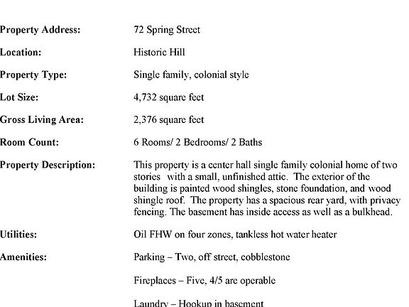 This property is a center hall single family colonial home of two stories with a small, unfinished attic. The exterior of the building is painted wood shingles, stone foundation, and wood shingle roof. The property has a spacious rear yard, with privacy fencing. The basement has inside access as well as a bulkhead. Not included in rent: Utilities and $20 monthly fire alarm monitoring fee. No pets allowed without prior written consent.