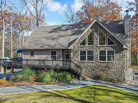Briar Hill North Chalet with Boat Slip Included....First time ever offered for sale! Built in 2013, this home was designed for retirement and features seasonal lake views of Lake Wallenpaupack! Featuring an open floor plan with beautiful hardwood floors, granite counter tops, kitchen Island, large dining area and spacious living room with a floor to ceiling stone fireplace as the focal point of the open concept floor plan. Cozy and inviting, this home has enough room for family and friends with a primary suite and one additional bedroom plus a full bath / laundry closet on the main floor and a second ensuite off the loft area overlooking the living room, grand fireplace and living area. The spacious decking off the kitchen is perfect for grilling and entertaining or just relaxing after a day on the lake. Not to be outdone, the lower level offers an additional room that could be utilized as an extra sleeping area, TV room or office space with an attached full bath. The lower level also offers a mechanical room / oversized pantry area and a garage setup that is a dream come true with room for 2 plus cars plus a spacious workshop. The outdoor patio space features a firepit and plenty of room for outdoor entertainment. This property comes with a double lot, Generator, several outdoor sheds and is fully landscaped for minimal maintenance.