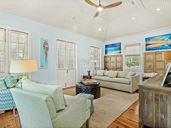 Tucked into one of WaterColor's most desirable Phase II locations, this beautifully maintained home on Thicket Circle offers peace, privacy and quick access to the very best of 30A living. Bordered by a small park in front and green space behind, the setting feels both spacious and serene -- ideal for those seeking a true coastal retreat with every amenity close at hand. A deep front porch, framed by mature landscaping, sets the tone for relaxed mornings and slow evenings. Step inside to a bright, open layout where the front-facing living room flows effortlessly into the dining area and updated kitchen. French doors lead from the dining room to a side deck, perfect for evening grilling or afternoon lounging. Thoughtful built-ins line the hallway, offering practical storage that blends seamlessly with the home's clean design. The primary suite is privately located on the first floor, tucked at the rear of the home for maximum privacy. A walk-in shower and generous layout make it a comfortable everyday escape. Upstairs, two guest bedrooms each feature their own ensuite bathrooms, offering comfort and privacy for visitors or family. A powder room and laundry area on the first floor add to the home's convenience. Outside, the long driveway provides ample parking and a large, fenced-in backyard big enough to add on, if desired. Whether you're heading to the Camp District playground and pool just around the corner or cruising to the gulf-front beach club, every destination is minutes away. WaterColor amenities include access to multiple pools, tennis and pickleball courts, a lakeside boat house, walking trails, and of course, the gulf-front beach club with dining and panoramic views. Publix, shops, and restaurants in WaterColor and Seaside, Florida, are a short ride away. With its peaceful location, functional layout and strong rental potential, this home is being sold fully furnished turnkey and a rare opportunity to enjoy WaterColor at its finest.