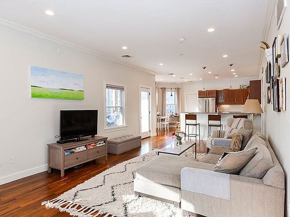 Offer accepted, open house Sunday 12:30-2, accepting back up offers. Stunning two bedroom condo in highly sought after Savin Hill location! Upon entering, you are greeted by natural light from a bay window highlighting the open-concept floor plan. This well-designed layout features a designated space for living and dining complimented by high-ceilings, crown moulding, and gleaming hardwood floors. Ideal for entertaining, the gourmet eat-in-kitchen with breakfast bar is complete with ample cabinetry and stainless steel appliances including five burner gas stove, microwave, dishwasher, and wine fridge. Access to a private deck is perfect for al fresco dining. The generous primary bedroom includes a large walk-in closet with jack-n-jill full bath featuring jacuzzi tub, in-unit stackable washer/dryer, dual vanity, and glass shower. A second bedroom with 2 closets, half bath, private storage, common patio, central air, and more round out this home!