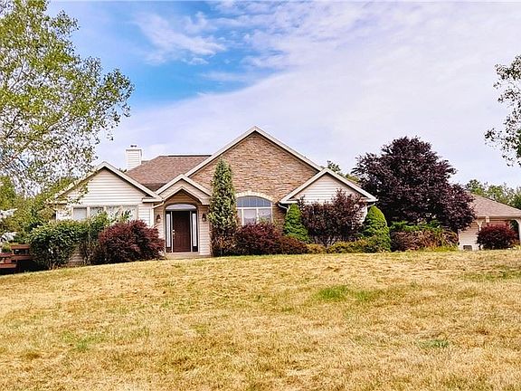 Large property nestled atop the hill overlooking the countryside. Beautiful 8 acre property with 3,446 square feet of home. Grand living room with high ceilings and fireplace. Huge open kitchen with beautiful countertops, eat-in kitchen, deck, & open flow into the living room. Aside from the large living space on the main floor, this house boasts a gigantic partially finished basement with its own full bathroom. This property has so much space both inside & out!