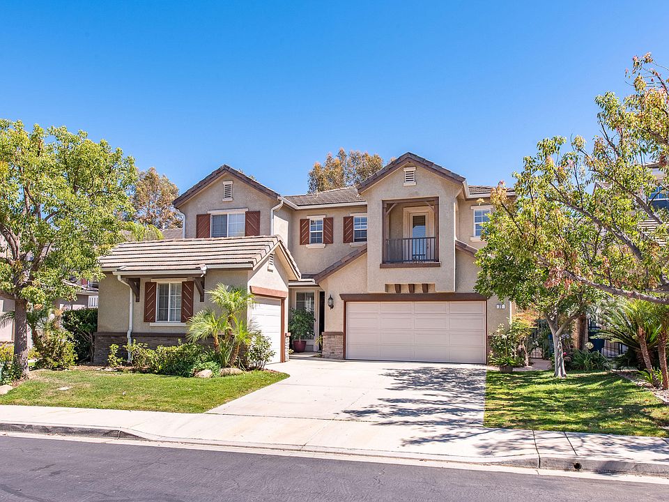 Wood Ranch - Cross Creek Community - Cul-de-sac location. Enter into this light and bright floor plan. Travertine flooring throughout entry, formal dining area, living room, kitchen and family room. Nice size family room light and bright features entertainment wall with media niche, wood-burning fireplace with a raised hearth. French door leads to nicely appointed rear yard with lattice covered patio and landscaping. Kitchen features lots of storage and functional counter space. Center island with breakfast nook. One bedroom down with bath. Upstairs features large master suite with 2 walk-in closets. Master bath with corner tub/separate walk-in shower. Jack & Jill bedroom with shared bath French door to covered deck. Fourth bedroom with private bath. Laundry upstairs. Fresh paint. New carpet. Central Vacuum - Three month new Lennox Heat/Air