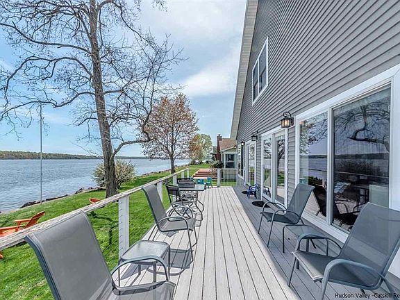 Hudson River water front living at it's finest. BREATHTAKING views of the majestic Hudson River accentuate this architecturally designed custom built home. With panoramic views watch the ships sail and the eagles soar across the Hudson River. Unlimited views from every angle with floor to ceiling windows on two sides of the house. Easy maintenance double pane glass sliding doors that open onto the wrap-around decking for year round enjoyment. First level open floor plan is perfect for entertaining with up close views of the Hudson River from the gourmet kitchen w/island and quartz counter tops, living room with propane fireplace and dining room area. One level retirement living also has master bdrm with spacious master bath, laundry room, 2nd bdrm and plenty of storage. There is also generous additional finished living space on the second floor for family or guests and also with it's own view. Step right down to the river where you have your own boat ramp. Kayaking, fishing (striped bass), and even rock skipping are a breeze right from your own back yard!-------Private location at the end of a dead end road yet minutes away from the conveniences of Kingston. With easy access to the Rhinecliff Bridge and the NYS Thruway. Conveniently located within a half hour drive of Culinary Institute, HITS, Bard College, Roosevelt Mansion, and the Rhinecliff Train Station. Open living with premier Hudson River Views and direct access to the water with over 100' of river frontage is what this home is about. Live the great life here.-------There is also a detached 2 car garage with additional storage area. As well as a gardening/tool shed/workshop that stands as a separate building. And additional storage can also be found in the pull down attic of the main house.