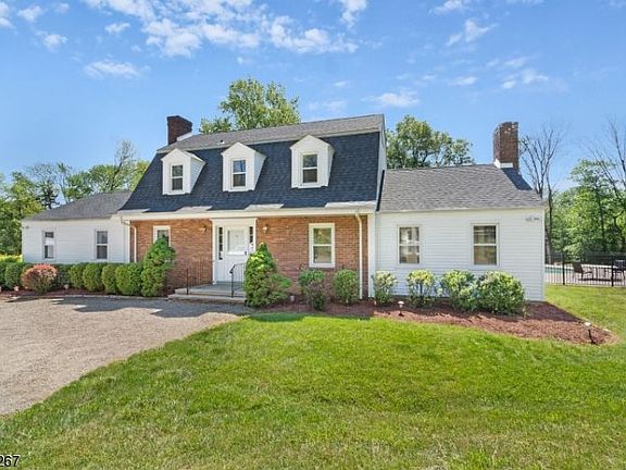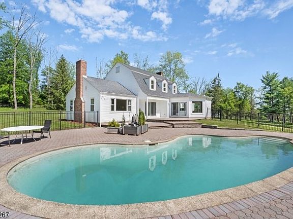 Tranquil serenity best describes this fabulous oasis situated in lovely Harding Township. Nestled in a desired part of New Vernon, this brightly lit Cape Code home sits on 4+ secluded acres and features 4 bedrooms, 3 full baths and recently refinished hard wood floors. The 1st floor welcomes you with a spacious Living Room with a gas fireplace, a formal Dining Room, a Family Room with a wood burning fireplace, 2 bedrooms, an updated, expansive kitchen with quartz counter tops, breakfast bar, backsplash with Cubica Blanco tiles by Porcelanosa, hood and appliances (2019). The breakfast room flows out onto the backyard to a paver patio surrounding an in-ground pool. The 2nd floor offers the primary bedroom and another ensuite bedroom. This charming residence sits well off the street where privacy and peaceful comfort abound and has the bonus of low taxes. Other upgrades include roof, gutters, leaders (2016), all windows (2 ), HVAC (2020), pool pump and heater (2020), paved driveway (2021) and many more. Located with easy access to NYC, trains, schools, shopping and highways. A MUST SEE!