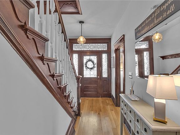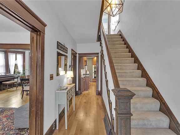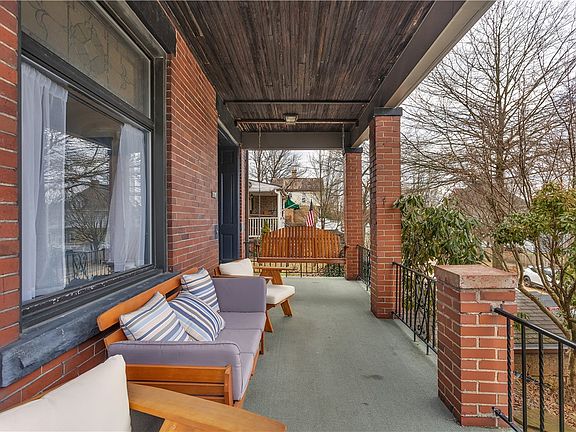 Lovingly maintained and thoughtfully upgraded, this classic Oakmont brick home is full of charm! A welcoming covered front porch leads inside, where hardwood floors and stunning original wood trim flow throughout the main level. The front living room features a decorative fireplace with a wood mantel and leaded glass window. Entertain family & friends in the spacious dining room, complete with a bay window, built-in cabinet, and another decorative fireplace. The updated chef’s kitchen boasts stainless steel appliances and a passthrough to the dining room. A cozy den at the rear, offers access to the patio with a stone fireplace—your perfect private retreat. Don't miss the powder room off the den. Upstairs, find three generous bedrooms, a cozy office, and a subway-tiled full bath. The third-floor owner’s suite impresses with a vaulted knotty pine ceiling, tile shower, and walk-in closet. The basement provides ample storage and connects to the attached garage.