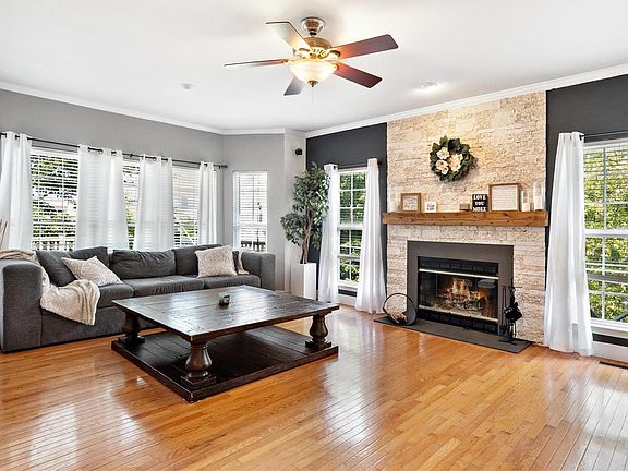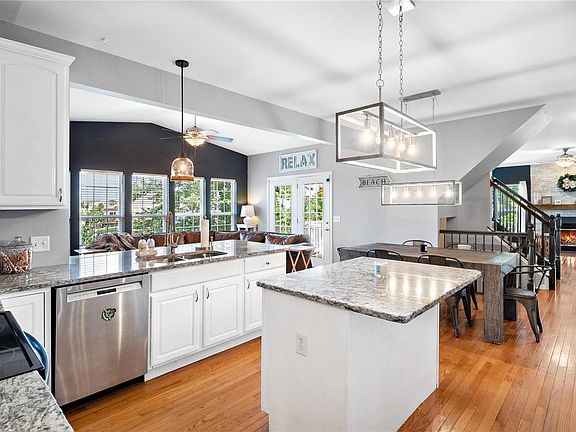 BACKS TO NEIGHBORHOOD LAKE! Popular Rowles floor plan with back stairs and hearth room. This one has everything you've been looking for: 3 car garage, cul de sac lot, 3.5 baths, big bedrooms, finished walk out basement, grand outdoor living spaces, no carpet on main level and drop zone off garage. Impeccable home with 9ft ceilings on first floor, wood burning fireplace in oversized living room. Kitchen has cabinets and counterspace galore! Granite countertops, stainless steel appliances, eating area and opens to vaulted hearth room which leads to massive deck overlooking quiet neighborhood lake. Finish in lower level gives you recreational area and flex room. Flex room has wall of cabinets and currently functions as an exercise room. Can easily be 5th bedroom. Full bath on lower level. Patio on ground level is covered and surrounded by gorgeous landscaping. Master bedroom is vaulted with sitting area and large closet. This one will not disappoint.
