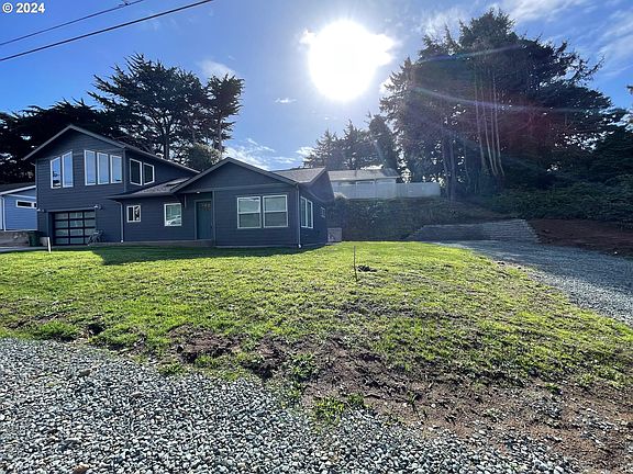 **Charming Coastal Home Located in the desirable Bandon Heights area** This beautifully renovated 1959 home combines modern comfort with coastal charm. The 3-bedroom, 2-bathroom home offers stunning river and ocean views from each level. The main level welcomes you with a spacious living room and large windows to enjoy the coastal landscape. Two bedrooms on this floor feature direct access to the backyard, and the guest bathroom includes a tiled shower tub combo and built-in cabinetry. The kitchen is a highlight, with custom cabinetry, stainless steel appliances, bar seating, and dining space. The garage with frosted panel doors provides easy access to both the front and backyard; 2 car garage door to front and single garage door to the back. The entire upper floor is dedicated to the primary suite, offering a private retreat with custom cabinetry, a cozy sitting area, and an ensuite bathroom with a tiled shower. Large picture windows and a wet bar complete this space, making it perfect for relaxing and taking in the views. The seller continues to enhance the landscaping, adding to the home’s appeal. Ideally situated close to Bandon’s Old Town, this property offers easy access to boutique shops, restaurants, outdoor water sports, pristine beaches, world-class golf, and grocery centers. This home is a perfect blend of coastal living and modern luxury.