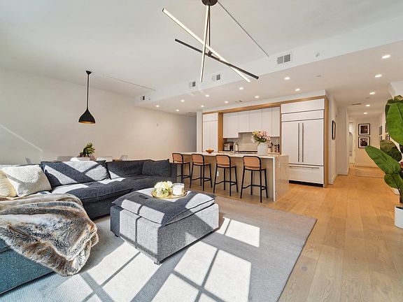The professional chef’s kitchen boasts timeless off-white cabinetry with white oak grain trim finishes, a full-height built-in pantry, and a large center island that comfortably seats at least four barstools. Additional features include: a waterfall countertop, recessed lighting, and elegant Calacatta Laza quartz countertops and backsplash. The kitchen is equipped with high-end appliances, including a Wolf gas range, Sub-Zero refrigerator, Bosch dishwasher, and Wolf under-counter microwave.