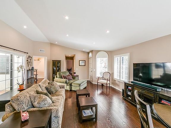 Gorgeous Wood Ranch home with fairway views! This 2 bedroom, 2 bath home with 1,228 square feet is in a gated community, situated on a corner lot with lovely trees for added privacy. A tranquil and quiet yard features a patio with spectacular views of the golf course. The living room is large with arched windows, dark wood laminate flooring, recessed lighting, a white brick gas fireplace and plenty of room for entertaining. Absolutely stunning kitchen with tons of cabinet space, stainless steel appliances, porcelain mosaic backsplash, center island with quartz counter and pendant lighting. The master suite opens to a lovely courtyard and has a walk-in closet, vaulted ceilings and a beautiful bathroom that feels like a spa and offers dual sinks; tile floors; quartz counters; separate water closet; and shower with a seamless glass door and custom Italian tile surround. Recently replaced central HVAC. Separate laundry room. HOA dues are $320/mo and cover home exterior/front yard, common area maintenance and access to community pool and jacuzzis. All of the windows and three patio doors were updated with new dual pane windows/doors. So many incredible design elements and features of this lovely home! It will go fast. Schedule a showing with REX and save!