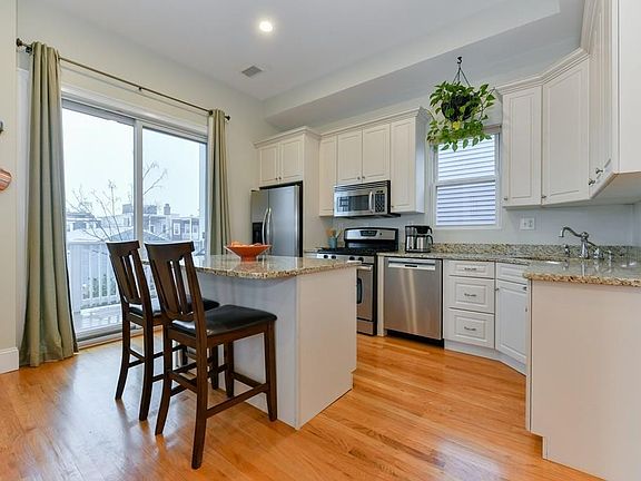 Penthouse-level 2 bed / 2 bath w/ PARKING + roof deck in highly desirable South Boston???s East Side is not to be missed. Relax & entertain w/ ease in this 1000+ sqft, 3rd fl condo boasting high ceilings, hardwoods throughout, open fl plan, 2 private outdoor spaces & amenities. Sun-filled living room w/ a gas fireplace & open shelving flows seamlessly into an upscale kitchen w/ slider. Entertain in your modern kitchen w/ granite counters, white cabinets, stainless steel appliances, & island for prep/dining. Take the party outside to a large & private deck or head to your very own roof deck for water & city views. South-facing master bedroom w/ en suite bath & excellent closet storage. Second bed makes for a great office, guest bed or nursery. Off-street PARKING, central A/C, in-unit laundry, basement storage as well as a pet-friendly/fully owner-occupied assoc. make this a rare opportunity. Perfectly set minutes from the beach, Castle Island, restaurants, public transit, & more!