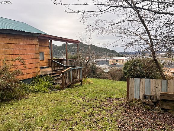 Looking for a fixer on a large, over 1/4-acre lot with lots of potential? This property offers tranquility with privacy behind and view overlooking Reedsport and a peek-a-boo of the Umpqua River from the covered deck (Added 2003). Please watch your step while on the property-especially on deck, beware on slick spots and trip hazards inside, do not bring children. Water and electricity are turned off- bring a flashlight. Seller has personal items/building materials in home, seller intends to remove personal items, building materials can stay. County has sq ft at 1,434, seller states that does not count the second bath and 2 bedrooms upstairs (App. 600 sq ft.- No record of permits for upstairs) Roof has leaked. NOT FINANCEABLE-AS IS-CASH ONLY!!!