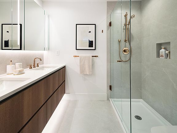 Smith & Farrow by Boffo - superior design, unparalleled craftsmanship. Enjoy unobstructed north-west mountain views right from the window at your kitchen sink. The bright kitchen overlooks a generous 233sqft balcony equipped with gas outlet and exterior lighting. Full-size 30" integrated Fisher & Paykel / Bosch appliance package with 5-burner gas cooktop and an abundance of storage including pantry wall. Choose your favourite custom kitchen table design at dining or counter height, made with cabinetry material and stone countertops. Ensuite features heated flooring, cabinetry drawers, medicine cabinets and multi-paneled mirrors with integrated lighting. 9' ceilings, European wide-plank flooring, air conditioning, three floors of amenities including outdoor pool and more!