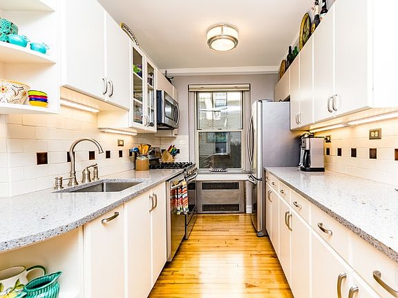 Step back in time as you enter this expansive and elegant one bedroom Art Deco Gem. A large foyer greets you and opens up into a world of gracious living and enjoyment. The open kitchen floor plan incorporates the dining area into large space in which you can cook and entertain your guess at the same time. The well-appointed kitchen comes with professional grade stainless steel appliances. The custom wood cabinetry is elegantly accented with handles to recreate the original Art Deco elegance. The quartz counter top goes all the way around to allow for plenty of kitchen accessories and prep work area. The large living room has a corner window with courtyard views and offers a beautiful space to relax and enjoy the quiet within this apartment. An upgraded windowed bathroom sits at the end of the rear hallway, next to the over-sized bedroom, where three windows offer sweet tree views and soft northern light. Double closets in the bedroom offer ample storage space, with additional linen closet in the hall. The apartment has a total of five super-size closets. There are 9 ft. ceilings and beautiful hardwood floors through the apartment. The amenities in the building include fitness club, storage facilities, laundry room, private courtyard garden, bicycle room and security guard and security cameras throughout the premises . Situated only a few steps from majestic Fort Tryon Park with famous vistas of the George Washington Bridge spanning the Hudson River, three season gardens, wooded promenades, terraces, eight miles of pedestrian paths and the World famous Cloisters Museum. Enjoy gourmet restaurants, trendy cafes, convenient shopping, playgrounds, dog runs and great transportation: the A train is steps away to take you to Midtown in 20 minutes. This property is within the PS 187 School District. Pets are welcome.
