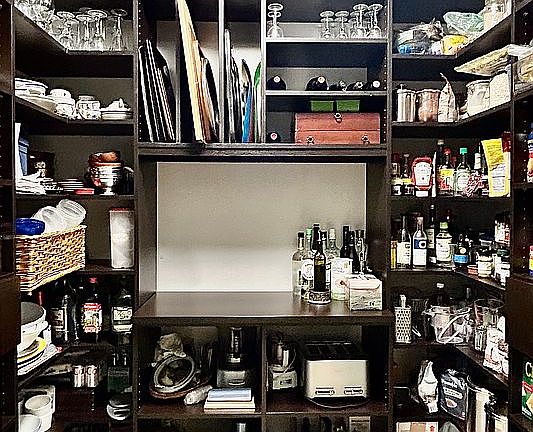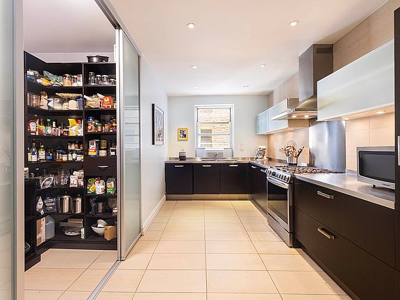 Wide windowed kitchen has sleek stainless counters and dark brown cabinetry. Appliances include LG stove, Bosch dishwasher, Sub Zero refrigerator - all with matching dark brown panels for an elegant and modern presentation. Neutral large floor tiles, and substantial pantry - designed by California Closets - with elegant sliding frosted glass doors, which match the upper kitchen cabinets that lift on gaskets.