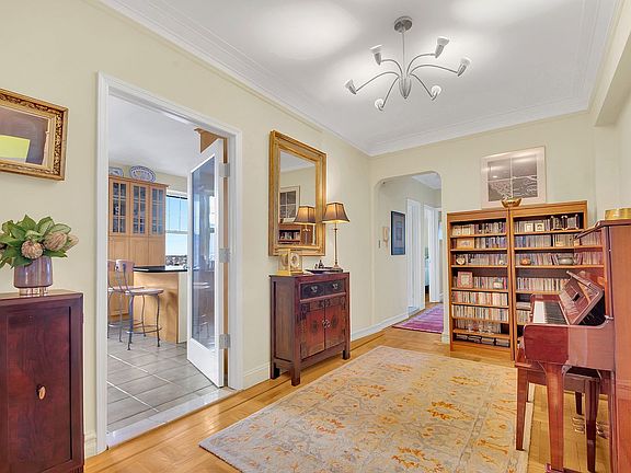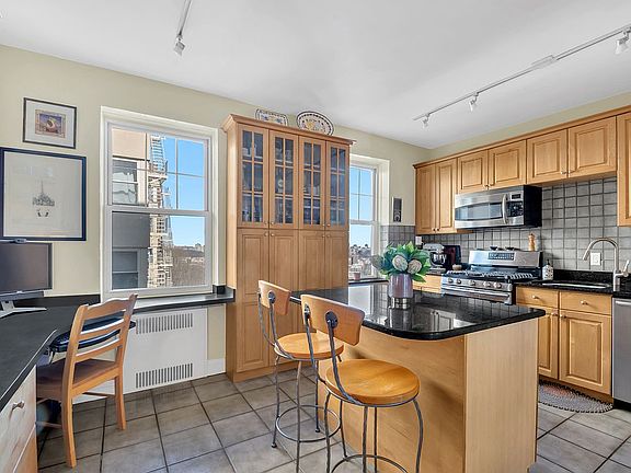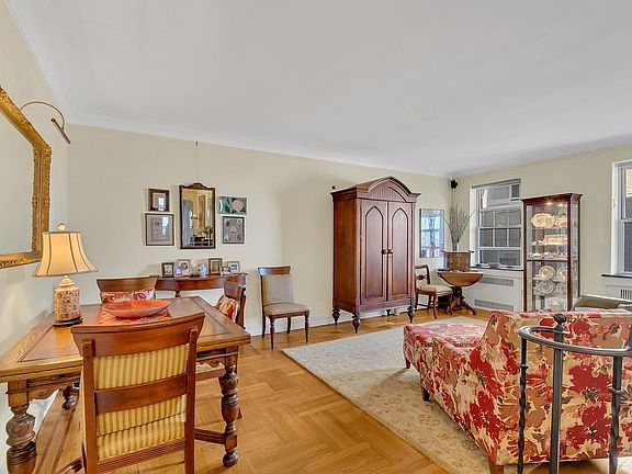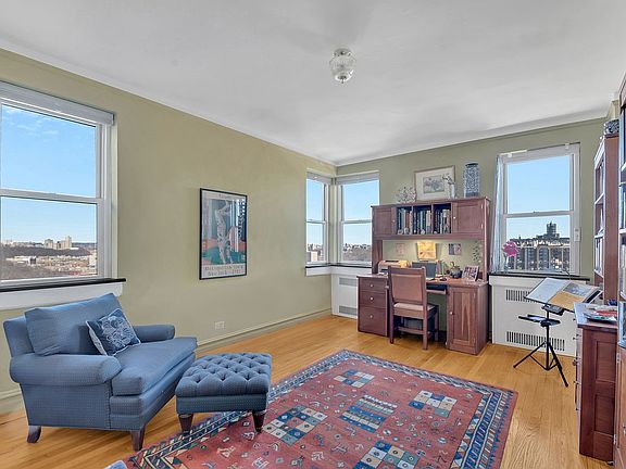 Magnificent Panoramic Views! It will not be difficult to adjust your everyday view to the 24/7 "observation deck" vistas from this bright, stunning corner apartment! This unusually quiet, gracefully proportioned 2BD/1.5Bath residence is a showcase of modern design and sophisticated taste for gracious entertaining and luxurious living. Originally a 3 bedroom, 1300 SQFT residence, this impeccably-renovated extra-large apartment is in one of the most sought-after pre-war art deco coops in Hudson Heights. While the 3rd bedroom and kitchen have been combined into one grand space, the original details of this home have been preserved: such as, a beautiful sunken living room, original oak parquet floors, painted plaster walls and ceilings, baseboards, crown molding, picture rails, and upgraded electricity to support modern kitchen appliances. The third bedroom and kitchen were combined into a one-of-a-kind, multi-use space. This large modern chef's kitchen features elegant custom, solid wood cabinetry with glass windows. Vast, luxurious black granite countertops provide ample space for food preparation, while the useful office/computer spaces…with plenty of bookshelves above and file cabinets below…can also double as a great buffet area when entertaining. Under-cabinet electrical outlets provide a dream space for the culinary inclined. Best-in-class appliances include a "Costco-friendly" massive stainless steel Samsung French Door refrigerator-freezer, a Samsung five-burner gas stove/convection oven, GE microwave/convection, and a large Bosch stainless-steel dishwasher. Additionally, the center island is perfect for prep, eat-in, and entertaining. Best of all, you will get to enjoy the natural light and view in any weather, all season long, while you eat, cook, and work. A large entrance foyer is a bonus, separated from the apartment entrance door, and is unique to this corner property “X” line. This well-proportioned foyer offers the feeling of a stand-alone room, instead of a single-use entrance foyer. Envision this space as your meet & greet cocktail lounge, formal dining area, reading room, music studio, or small informal lounge with a bistro table. The possibilities are endless! The pin-drop quiet oversized master bedroom has four windows with an unobstructed open view and an ensuite half-bath. This room could be easily divided into two comfortable bedrooms for additional private space. The large second bedroom is currently functioning as the primary bedroom and can hold a queen-size bed, plus night tables and a club chair. 720-730 Fort Washington Ave Co-op is in one of the most sought-after Art Deco buildings in Hudson Heights. This immaculate pet-friendly Co-op offers Gym ($240/yr), live-in super, porters, a live-in handyman, evening security guards, storage facilities, two laundry rooms, two bike rooms, bellman's luggage carts for residents' use, private courtyard gardens, and ramp accessibility from the main street. Situated a few steps from the building entrance is the majestic Fort Tryon Park with famous vistas of the George Washington Bridge and the Hudson River. Near the park entrance, one can find Manhattan's largest dog run, numerous seasonal gardens, wooded promenades, terraces, eight miles of pedestrian paths, and the world-famous Cloisters Museum (part of the Met Museum). This outstanding property is near playgrounds, parks, restaurants, shops, public schools, and parking garages. The A train is steps away to take you to Midtown in 20 minutes. There is a current monthly fuel surcharge of $123.23 ending Aug 2023. Showing by appointment only, flexible showing hours.