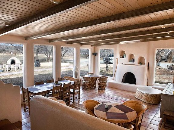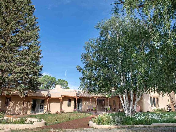 Exquisite secluded location on the Rio Pueblo river with lots of "old Taos charm". The Hacienda Rio Pueblo is a large adobe home with stately birch ,cottonwoods, and an apple orchard. 7.48 acres allows room for horses or farming with plenty of room to roam. There are 9 large bedrooms each with a kiva fireplace and 9 bathrooms. The hacienda has an inviting living room area and a dining room big enough to accomodate large family gatherings. Both living room and dining room have fireplaces which create a cozy setting on cold winter nights. Several large patios surround the home and are perfect for enjoying all of the sunsets and sunrises for which Taos is famous. Historically this was a single family home, but has also been used as a B&B, and VRBO, for income producing short term rentals. The setting is very private, but only 5 minutes from downtown of Taos . If you ever dreamed of living in a pastoral setting with lots of room for friends and family this home is a great choice. Graceful living, stunning sunsets and river frontage create a rare find in northern New Mexico.