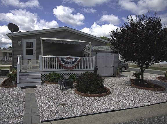 Nicely updated spacious manufactured home in Cape Meadows Adult Community. Unique to the community, positioned on a corner lot, this large 3 BR/2 BA home boasts 1,158 sq ft. Upgrades include hardwood flooring, a center island, a new deck with retractable awning, storage building, mature maintained landscaping. Land rent is $410.00/month.