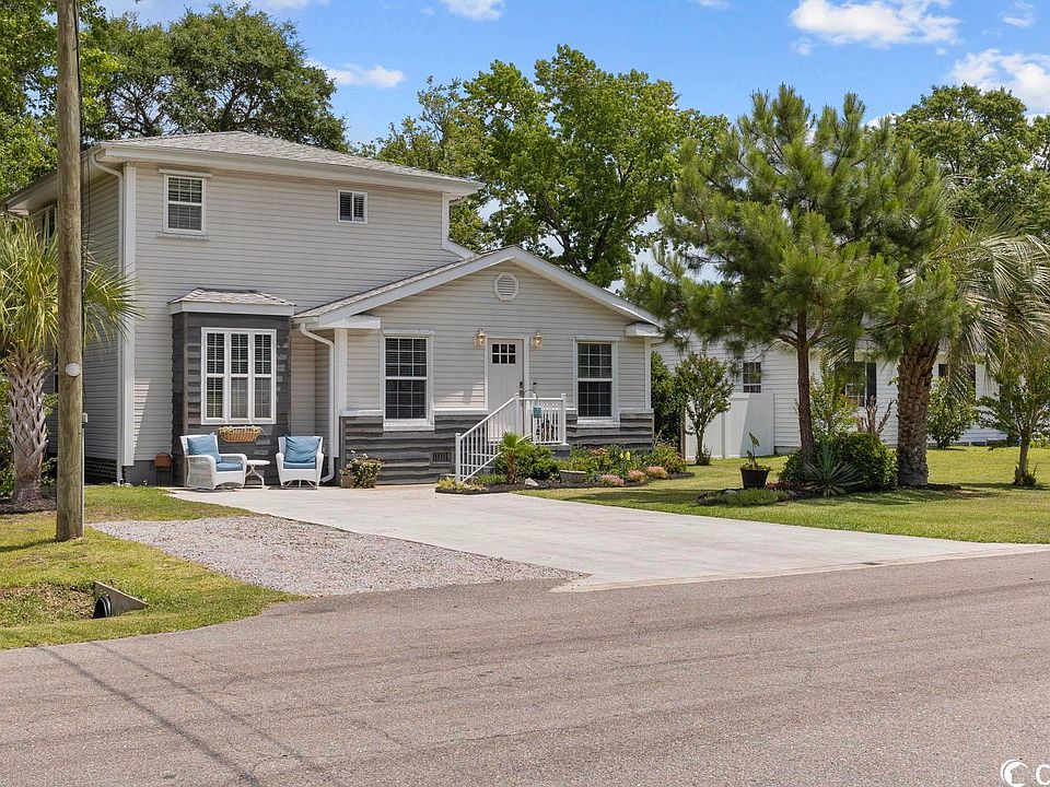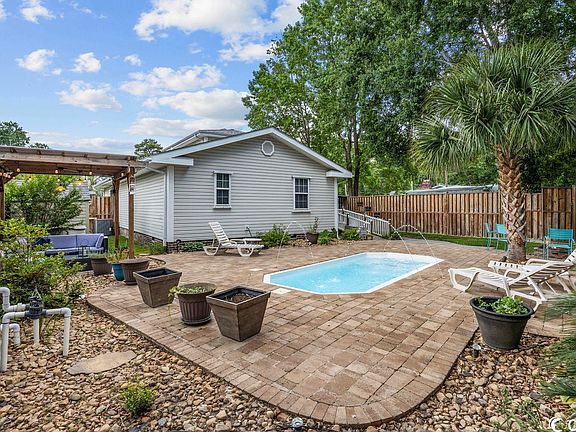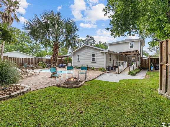Wow! Beautifully renovated coastal home with modern farmhouse flare located in desirable Surfside Beach! Only 5 blocks to the Atlantic Ocean! Private heated "California" pool with custom color lighting system, overhead fountains and inset deck lighting to impress your friends and family or simply to enjoy on your own while relaxing under one of the two pergola porches with total privacy offered by the 7 foot privacy fence surrounding the rear and side yards! Amazing layout with 4 bedrooms, 3 full baths (3 Bedrooms, two full baths Downstairs and Large Primary bedroom, Primary bath Upstairs). You will be easily impressed by the spacious primary ensuite with gorgeous soaking tub, separate tiled shower, double vanity/double sinks and massive walk-in closet plus easy walk-in attic access! 2 living areas with tongue & groove wood accent walls, gourmet kitchen, granite countertops, large butlers bar, island with USB ports, large cedar pantry and stainless steel appliances! Great laundry room! Wide stairs to 2nd floor. Specialty "Owens Corning Duration Premium Cooling shingles" roof installed 2020. New HVAC 2017. Detached storage shed in east side yard. Home also includes exterior hurricane shutters and golf cart parking on west side of home. Don't miss this one... it is a gem!
