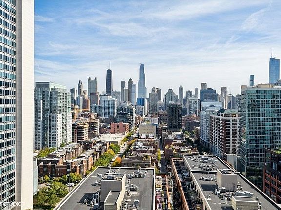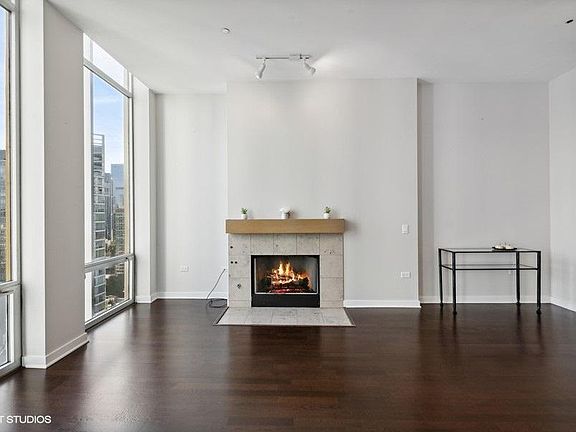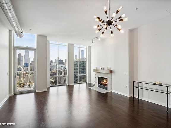 17th floor one bedroom soft loft in the heart of River North with unobstructed East-Facing breath taking views. Floor-to-ceiling windows and a private balcony show sweeping million dollar views of the city, lake and river. The interior features an open layout with hardwood floors, 10' concrete ceilings, kitchen with limestone counters, stainless steel appliances, a gas fireplace and full size in-unit washer/dryer. The spacious bedroom has an incredible full wall of closets with custom shelving. Steps to the Riverwalk, Montgomery Ward Park, dog parks, Erie Cafe, East Bank Club, brown/purple line and everything that River North has to offer. Secure building features a 24-hour door staff, on-site management, updated lobby, bike room and a fitness center with state of the art equipment. Rent includes central air, heat, and 1 heated garage space