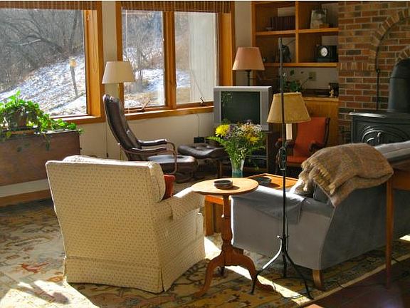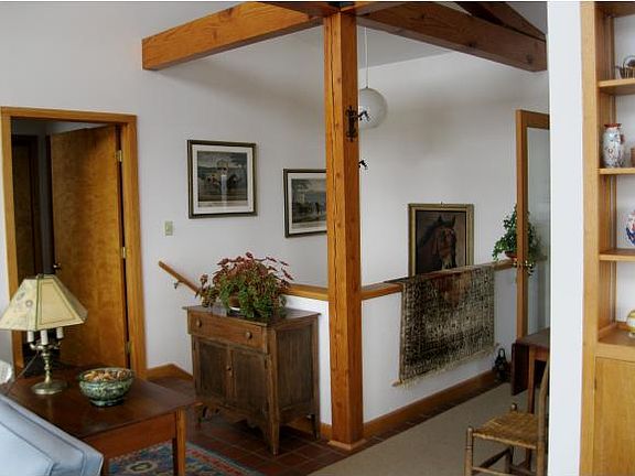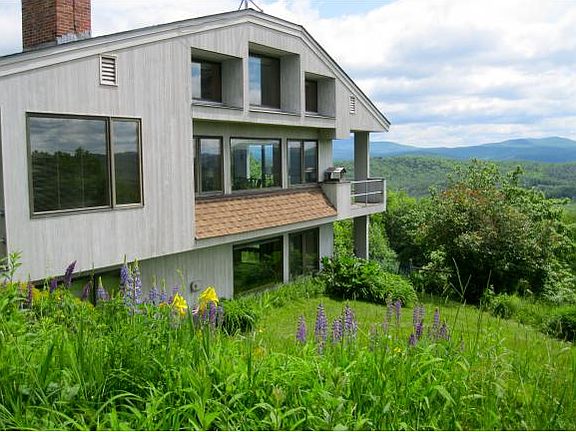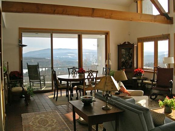 Soaring views! Energy efficient passive solar contemporary designed by Lyme, NH, architect, Don Metz. Light, sunny interior with cathedral ceilings in living and dining area. Excellent southerly exposure. Located on quiet country road in beautiful pastoral neighborhood with an abundance of conserved acreage. Spacious covered deck off living room, and walk out to patio on lower level. Protected views. Immaculately maintained home. Imagine waking every morning in this setting!