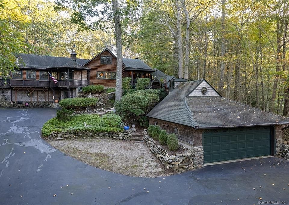 Spacious Custom Built Log Home is sited on private lot. Convenient location with easy access to shopping, town and transportation. This home has two custom stone fireplaces, one in the family room and one in the Living Room. And, both fireplaces can be seen from the Dining Room. To the back of the house, facing south, is a sunroom ideal for plants and enjoying the sunlight on a cold winter's day. The Kitchen has a pantry and nice breakfast area. The primary bedroom and large bath are on the first floor and there are two bedrooms, a loft and a full bath on the second floor. There is a covered walkway from the garage, a covered front porch and good-sized mud room. The walk out basement affords great storage, workshop space and easy access to all the mechanicals. This home is a delight. The level back yard is landscaped and has a large deck off the side of the house with a gazabo great for sitting and enjoying the natural surroundings. and fenced There is a detached studio currently being used as an Irish Pub!
