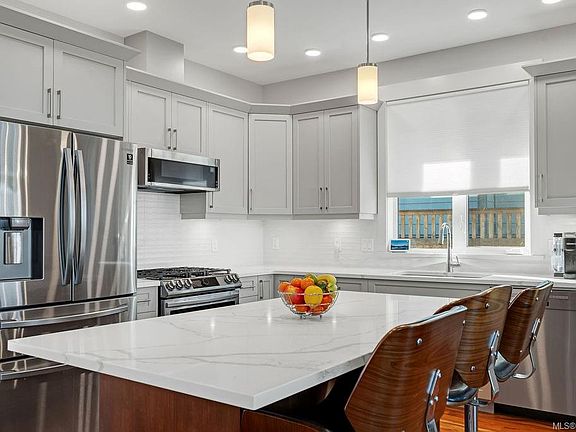 Modern kitchenPainted wood cabinetsQuartz countertopsStainless steel appliancesTile backsplashPrivate fenced backyardPartially covered patio