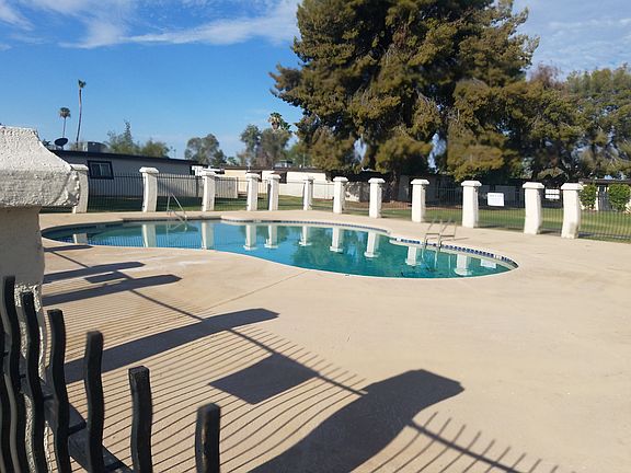 This unit is Located at Dobson and 8TH Ave in the Sky View Mesa II Community. Features include a large enclosed patio area with a covered patio with fan and 2 storage areas. Inside you will find all tile flooring. The Living room is good sized and sits off the Open Kitchen. One Bedroom has its own exit to the courtyard. 5% tax and administrative fee. $400 non refundable + $25 monthly pet fee. Only one pet allowed in the home. Please visit our website at rpmeastvalley.com to schedule a self showing. Assigned Outdoor Parking Community Pool Dryer (Elec) Fenced Heat (Electric) Laundry Room Patio / Deck Pets Allowed Shed / Storage Stove / Oven (Elec) Washer Washer / Dryer Hookups