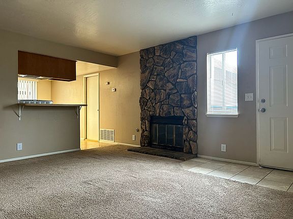 Two bedroom, one bathroom downstairs unit with L-Shape Kitchen, white appliances, faux wood Formica countertops, open bar, eat-in kitchen, vinyl flooring and sliding door leading to covered backyard patio. Carpet in living room with with river stone fireplace surround (fireplace for cosmetic use only). Carpet in both bedrooms, and hallway with plenty of storage and vinyl flooring in the full bathroom. Washer/Dryer hook-ups located in the garage. Forced air heating and Evaporative Cooling. Fenced backyard space. Refrigerator provided but not warrantied.