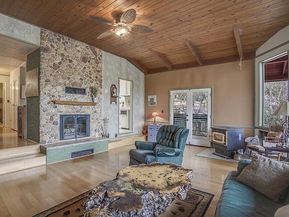 RIVER COMMUNITY CABIN WITH CLOSE PROXIMITY TO THE NATIONAL FOREST! Escape to this tranquil location on a double lot and enjoy the serenity of nature, listen to the sound of the river and wind through the pines. This 3 bedroom / 2 bath cabin has wood floors, stone fireplace, charming kitchen and a dining area overlooking the Great Room. The master bedroom has an en suite bath and the two guest bedrooms share the second bath. The large lot provides for a plumbed hot tub area, firepit, two storage sheds, a chicken coop and greenhouse. Lots of closet space! The spacious deck overlooks the gardens -- relax on the deck in the evening, looking to the skies where you will see galaxies of stars, what an amazing place!