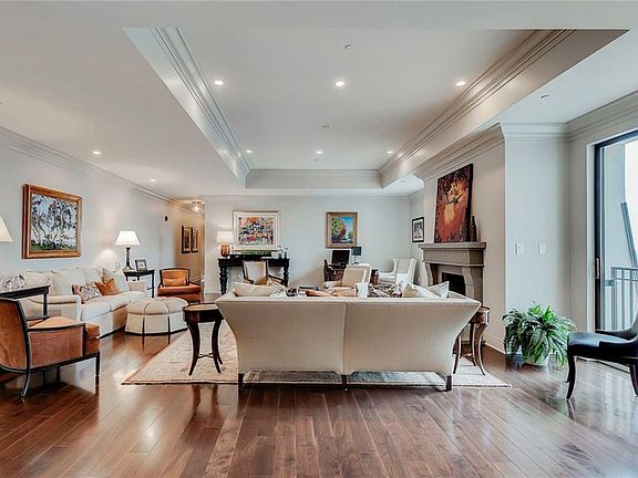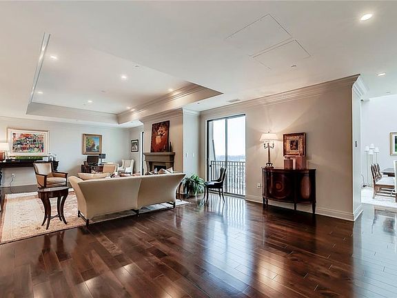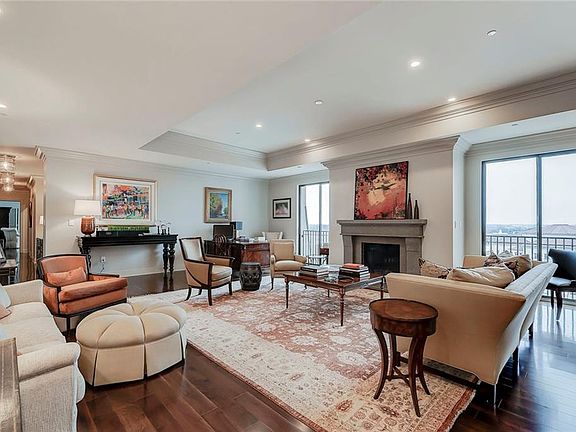 Breathtaking views await you in this amazing Penthouse. Open floor plan allows for tremendous, natural light and views from everywhere. Entry leads to great room with hard wood floors and fireplace. Adjacent dining room has a two-story ceiling with sky lights and magnificent kitchen with custom cabinetry, marble tops, and an appliance package any chef would consider worthy- also includes a balcony right off of the kitchen! Heading south from the great room to the bedroom corridor, you have a formal powder bath appropriately appointed. Guest bedroom/den has an on-suite with custom cabinetry. Master bedroom has a private balcony, walk-in closet space, beautiful woodwork, and spa-like bathroom floor to ceiling in Carrera Marble.