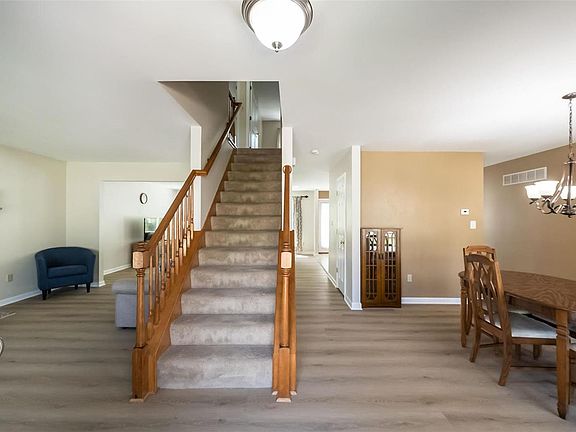 Captivating 2-story nestled in the esteemed Bluffs/Romaine Subdivision with impeccable curb appeal, fresh landscaping, and a bubble water feature. A welcoming foyer, greets you with a formal DR on the right, and a convenient half bath, or to a spacious FR and LR to your left. Large windows provide natural light, accentuating the gas fireplace, and creates a cozy atmosphere. An open kitchen is a chef's dream, w/ granite countertops, black SS appliances, and a breakfast RM where style meets functionality. MF laundry and an oversized 2-car garage complete this floor. Upstairs, 3 bigger BR's plus a sizable primary suite, providing ample space for R&R or a growing family. The LL offers versatility with a walkout, half BA, plentiful storage, and a rec room for entertaining. Outside, a composite deck, storage shed, and pristine yard backing to trees make indoor/outdoor living a breeze. Enjoy the nearby subdivision pool, is a stone's throw from your front door! Don't miss out on this beauty! Additional Rooms: Mud Room
