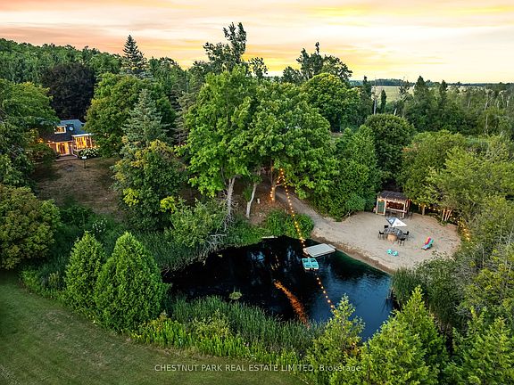 Spectacular 1 acre property with picturesque pond views, private beach, and your own tiki bar, with hydro! Spacious, and well laid-out 2250 square foot side-split home offers 2 expansive living spaces, 4 bedrooms, a finished basement with shop, large attached 2 car-garage with interior access, and sunroom for enjoying the view. Laminate flooring runs throughout with new (2025) carpet in primary and second bedroom. Lower family room with charming beamed ceilings and stone fireplace offers a walk-out to patio where you can enjoy summer time barbecues. Circular drive offers lots of parking with additional space in 2 car garage for all of your toys! A true rustic retreat with beautiful sunset views, privacy, unmatched backyard entertainment and room to grow for a lifetime. Roof 2025. Central vac. Furnace approx 2018. Depth of well 17.4 metres as per well record attached. *Septic inspection, pump out receipt and floorplans attached*