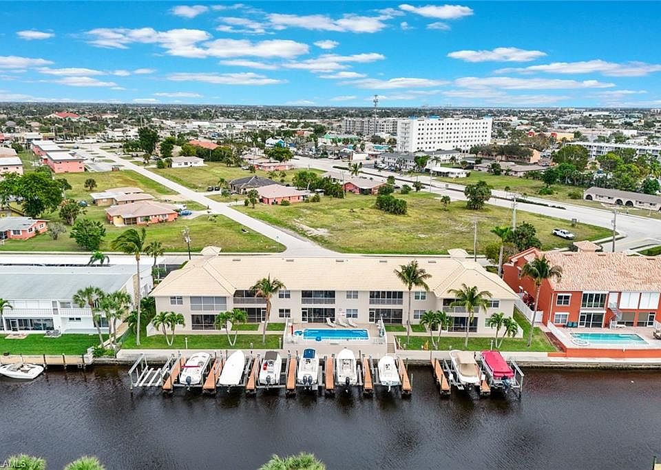 Discover the pinnacle of waterfront living in this stunning 2-bedroom, 2-bathroom condo just moments from downtown Cape Coral. Boasting direct gulf access with no bridges, embark on a 20-minute ride to the river, unlocking a world of maritime exploration. Southern exposure graces this residence, ensuring year-round sunsets that paint the sky in a mesmerizing palette of hues. Step onto the expansive screened lanai, a tranquil haven to savor the breathtaking views and embrace the coastal breeze. A boater's paradise, the property features a private boat lift with an impressive 10,000 lbs capacity(power+water at each slip), accommodating vessels up to 28 feet in length. The captain's walk and impeccably maintained docks enhance the allure, creating an idyllic setting for nautical enthusiasts. Outdoor entertainment is elevated with easy access to the pool and hot tub, both redone in 2022. Immerse yourself in the refreshing pool or unwind in the soothing embrace of the hot tub. Tile flooring throughout. New AC, dishwasher, and washer/dryer. Your peace of mind is paramount, knowing that this home stood resilient against Hurricane flooding, and holds strong reserves. Two pets (30lbs). The community emanates an atmosphere of genuine hospitality and camaraderie, fostering a welcoming environment that embraces newcomers with open arms.