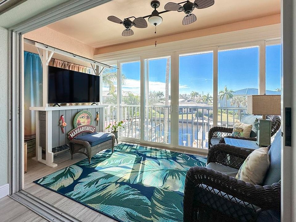 Just two blocks from the Bimini Basin and only 20 minutes to the river at idle speed, this exceptional waterfront condo is ideal for enjoying Southwest Florida's exceptional waterfront destinations. With a newer 7500 pound Golden boat lift, this condo is ready for you and your boat! Beautifully updated and decorated, this second floor condo with southern exposure has beautiful views over the pool of the canal. With volume ceilings, wood plank tile and Behr Bayberry Frost paint throughout, 5-1/2' baseboards, LED can lighting, lovely high- quality window treatments, newer ceiling fans and light fixtures, and a fabulous kitchen featuring white shaker-style wood cabinets, quartz countertops, glass tile backsplash, and black stainless steel appliances, there is no work to be done! AC was replaced in May 2018. The large exterior private storage closet offers added convenience as does the covered assigned parking and ample guest spots. Pet- friendly! Located minutes from the extensive shopping and dining options of Cape Coral Parkway, this exceptionally maintained condo is an incredible opportunity. This is a perfect new home for you and your boat!