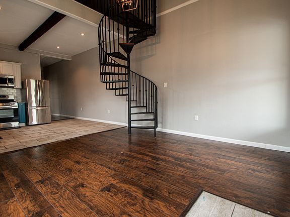 Inside, you'll be welcomed by a large, open living room perfect for hosting friends and family. The open kitchen includes a refrigerator, oven range, and microwave. The spiral stairs lead to an open-space bedroom with its own bathroom. A short hallway leads to the primary bedroom with a large closet, the second bedroom and a full bathroom. A washer and dryer are also included for your convenience.