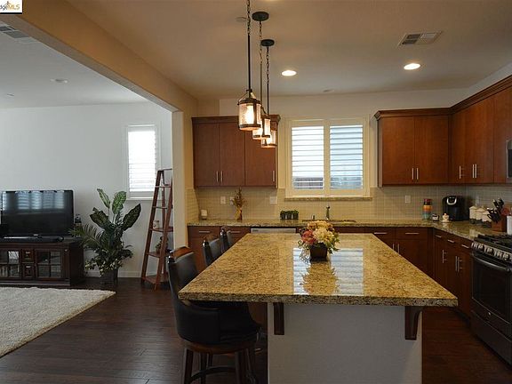 WHY BUY NEW AT EMERSON RANCH? This two year new home has thousands in upgrades! Wood flooring throughout first floor featuring one bedroom and bath downstairs. Highly upgraded kitchen with custom backsplash, granite, large prep island and stainless steel appliances. Plantation shutters throughout. Custom paint color on first floor. Most bedrooms feature a walk in closet. Spacious master with spa like bath. Backyard features stamped concrete and patio cover. Close to park and walking path around lake. Close to commute routes, schools and shopping.