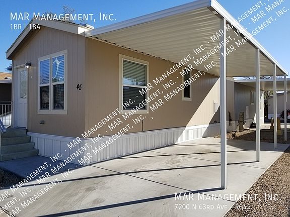 This 406 square foot apartment home has 1 bedrooms and 1.0 bathrooms. This home is located at 7200 N 43rd Ave #RG45, Glendale, AZ 85301.