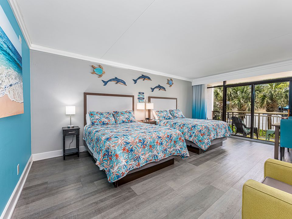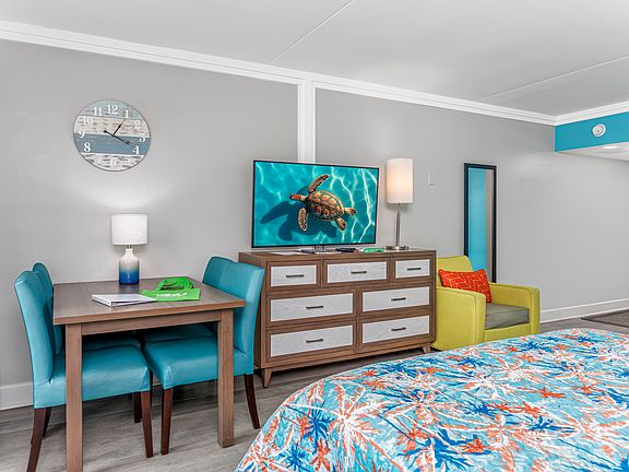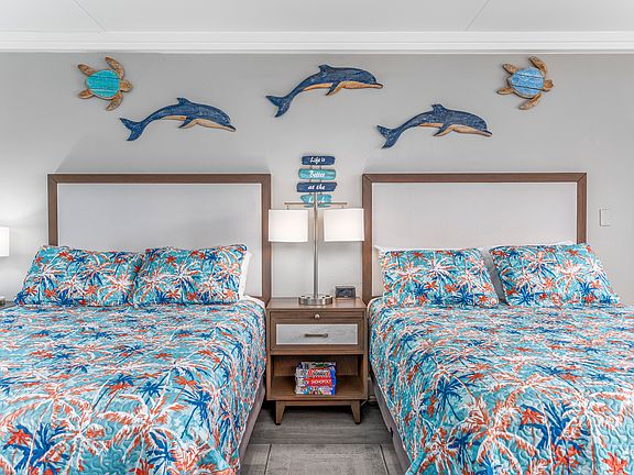 This second-floor unit features 2 queen beds, a full bathroom with tub/shower combo, and a balcony with an obstructed ocean view. Microwave, mini fridge, air fryer, toaster and dinnerware. Beach chairs, bedding, bath towels (free use of pool towels through resort), one chair, dresser, place to hang clothes, dining space for 4, large smart TV with cable, and utilities are included. Free parking for up to 2 vehicles.