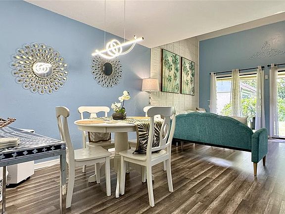 Gated front entranceNew led lighting fixturesFresh interior paintUpdated vanitiesIndoor laundry roomBonus flex spaceLarge in-ground community pool