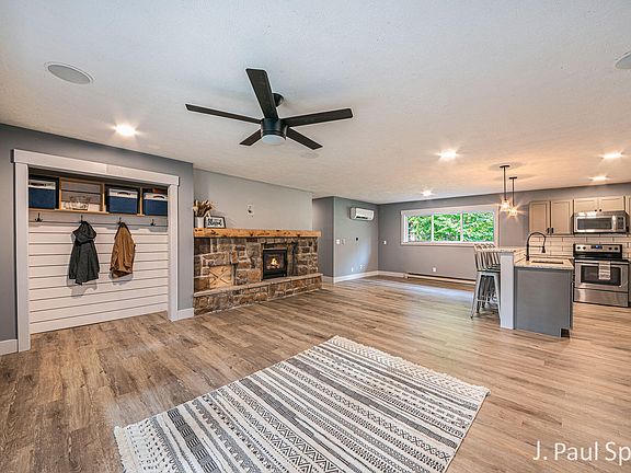 Welcome to this charming ranch home located in Caledonia Schools. Everything has been meticulously updated from top to bottom, literally! Walk right into the open concept living room with a beautiful wood-burning fireplace that flows into the dining area & stunning kitchen. Also featured is the primary suite with a walk-in closet, 3 additional bedrooms, a gorgeous secondary full bath, & an oversized laundry/mud room w/access to the garage. Sitting on just over ½ acre, there's plenty of room for entertaining, gardening, & much more! Enjoy the large storage shed, 2 stall garage & walking distance to Kettle Lake Elementary, Kettle/Campau Lake, Mike's Pizza, & Campau Corner! You'll benefit from the 'berm' style construction with extremely low energy bills. MORE... Plus, enjoy the convenience of 3 different sources of heat; wood burning fireplace, electric baseboards, and a mini split unit that both heats and cools. Listing agent is related to Seller.