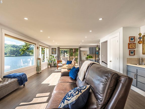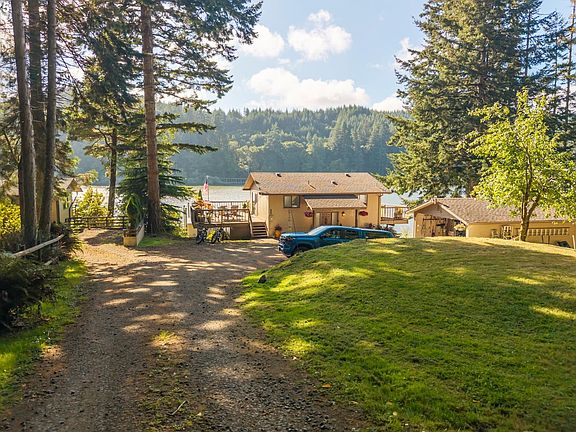 Lakefront paradise on sought-after North Tenmile Lake! This beautifully updated 2 bed, 2 bath home offers sweeping lake views from nearly every room. Surrounded by nature and nestled in privacy, this retreat features a beautiful front and backyard, along with expansive decking perfect for relaxing or entertaining. Enjoy modern finishes throughout, including a bright, open-concept living area that brings the outdoors in. Wake up to serene water views and end your days with unforgettable sunsets. Property includes a boat house for all your lake toys, plus a carport for convenience. Just an easy 8-minute drive to town for shopping, dining, and essentials—this lakefront gem offers the ideal mix of comfort, convenience, and coastal charm.