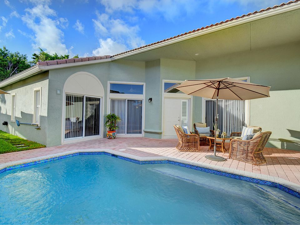Feel the ocean breeze in this unique, hard-to-find Courtyard layout. Bright and open 3-bedroom, 3-bath home full of natural sunlight. Prime east Boca Raton location in sought-after gated community of Boca Preserve. All living areas have large sliding glass doors that surround spacious pool/patio. Home faces southeast - lots of sun on pool! Stainless steel appliances in large kitchen. Luxurious Master Suite. Third bedroom, detached from main home, ideal for guests or private office, includes its own full bath and walk-in closet. Many recent updates: high-end plantation shutters; pool resurfaced with beautiful glass tile; upgraded variable-speed pool pump and saltwater system installed; fenced side yard. Perfectly located halfway between both Boca and Delray downtowns. All A-rated schools.
