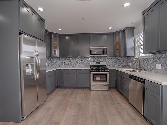 Modern white shaker cabinetsLush well-maintained landscapingMosaic tile backsplashQuartz countertopsStainless appliancesModern tiled bathroomsSpacious bedrooms