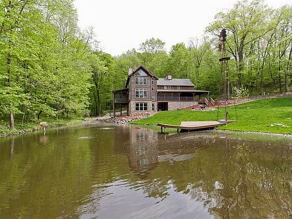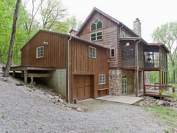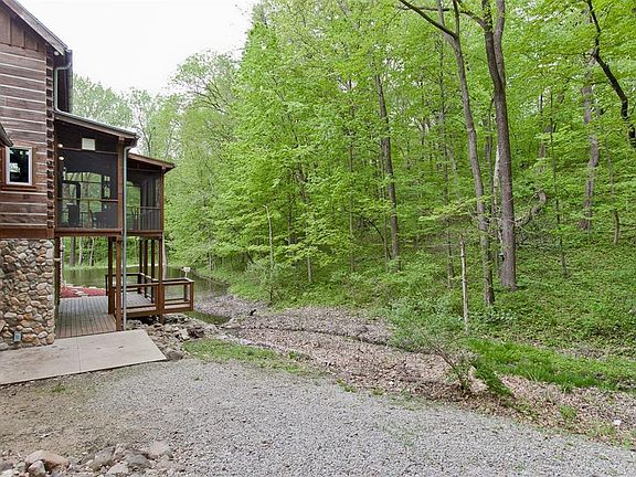 One of a kind in town acreage-- ideal for privacy and space with a convenient NE side location. Nestled in the woods on 3.79 acres the property boasts a stream, pond, and stunning outdoor entertaining. Multiple decks and patios on every level with stunning views of all the property add bonus living space. One patio even features a wood burning stove! Inside you will find views of nature from every window. Featuring an open floor plan with stunning two story vaulted ceilings. Hardwood floors throughout have all been refinished this spring. Master bedroom features a stone wood burning fireplace, on suite bath and laundry, plus a loft space over looking the two story living room and gorgeous views. The lower level features 2 bedrooms, a full bath and laundry. Also on the lower level is a rec room with kitchenette. This property has too many features to list and needs to be seen in person-to capture it all.
