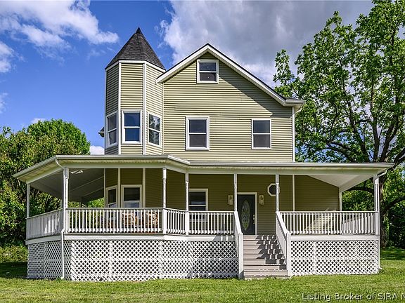 IT'S ALL ABOUT THIS PORCH! If pictures are worth 1000 words, feast your eyes on these! Located in Charlestown, this home offers the best "front porch sittin" you're likely to find around here. It has so many updates and is truly MOVE IN READY. Elegant vibe throughout with 9'-10' ceilings on both living levels. New Jeld-Wen windows, new doors, roof, gutters, A/C, kitchen, bathrooms and of course, lighting and plumbing fixtures, paint and flooring. This gorgeous oversized wrap around porch screams SOUTHERN CHARM. What a rare opportunity to own a newly renovated home of this caliber and this AMAZING NEW PRICE will turn some heads! Check it out: It's eligible for USDA 100% financing. BTW, there's plenty of room to build a garage, if you want! SPECTRUM Internet available here. This location is about 19 miles to LOUISVILLE, 4 miles from Charlestown STATE PARK (and all that has to offer), as well as an easy drive east to HANOVER (18 miles) or MADISON (30 miles), or head north to Scottsburg (17mi).