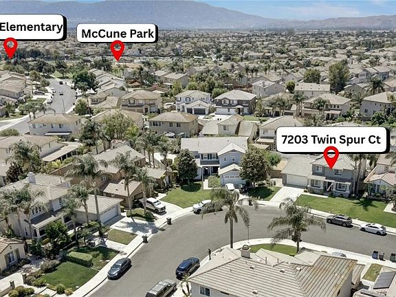 Beautifully upgraded 4 bedroom, 3 bathroom cul-de-sac home in the heart of Eastvale. Walking distance to Barton Elementary and McCune Family Park. This spacious floor plan includes one bedroom and full bath conveniently located downstairs, plus a 3-car tandem garage. The remodeled kitchen (2023) features quartz countertops, soft-close cabinetry, stainless steel appliances, beverage fridge, under-cabinet lighting, reverse osmosis system, and a 9 ft. bar-height island with outlets, wireless charging, and extra storage. Additional upgrades include luxury vinyl plank flooring with 4” baseboards (2022), built-in cabinetry with outlets, and new ceiling fans. The primary suite offers a walk-in closet, soaking tub, upgraded quartz vanity with dual sinks, and new lighting and mirrors (2023). All upstairs bedrooms include built-in closet systems, with fresh interior paint in 2025. Exterior highlights include motion-sensor security lighting, hardwired Ring cameras, and exterior paint completed in 2022. Make Eastvale your home with Award winning schools and over 20 parks to visit, including 3 dog parks, 2 splash pad parks and a trail system that will take you from Archibald to Hamner Avenue.