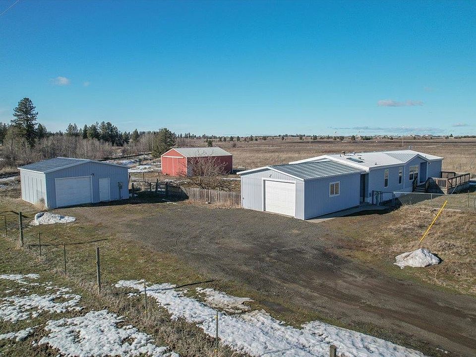 Welcome home to Welcome Road! 9+ acres, 2 Garages, 1 Shop/Barn & a meticulously clean manufactured home featuring 3 bedrooms, 2 bathrooms, mix-use room for private office/4th bedroom (non-conforming) & bonus sun room. This one level floor plan offers great room style living room w/vaulted ceiling, East to West facing windows offer sunrise & sunset views. Owner’s ensuite bedroom w/private bathroom. Light & bright kitchen, w/eating island, large pantry, informal dining area & numerous East/West facing windows for sunrise & sunset views. Enjoy comfort features of forced air heat & AC, vinyl windows, fully fenced property & front/backyard yards. 11 GPM well, 3 water spigots, west side yard in-ground sprinkler system. Gravel RV storage area. Private living with quick access to Medical Lake, Cheney, Airway Heights, Fairchild AFB & I-90 (15 mins to Spokane). You will Love this home!